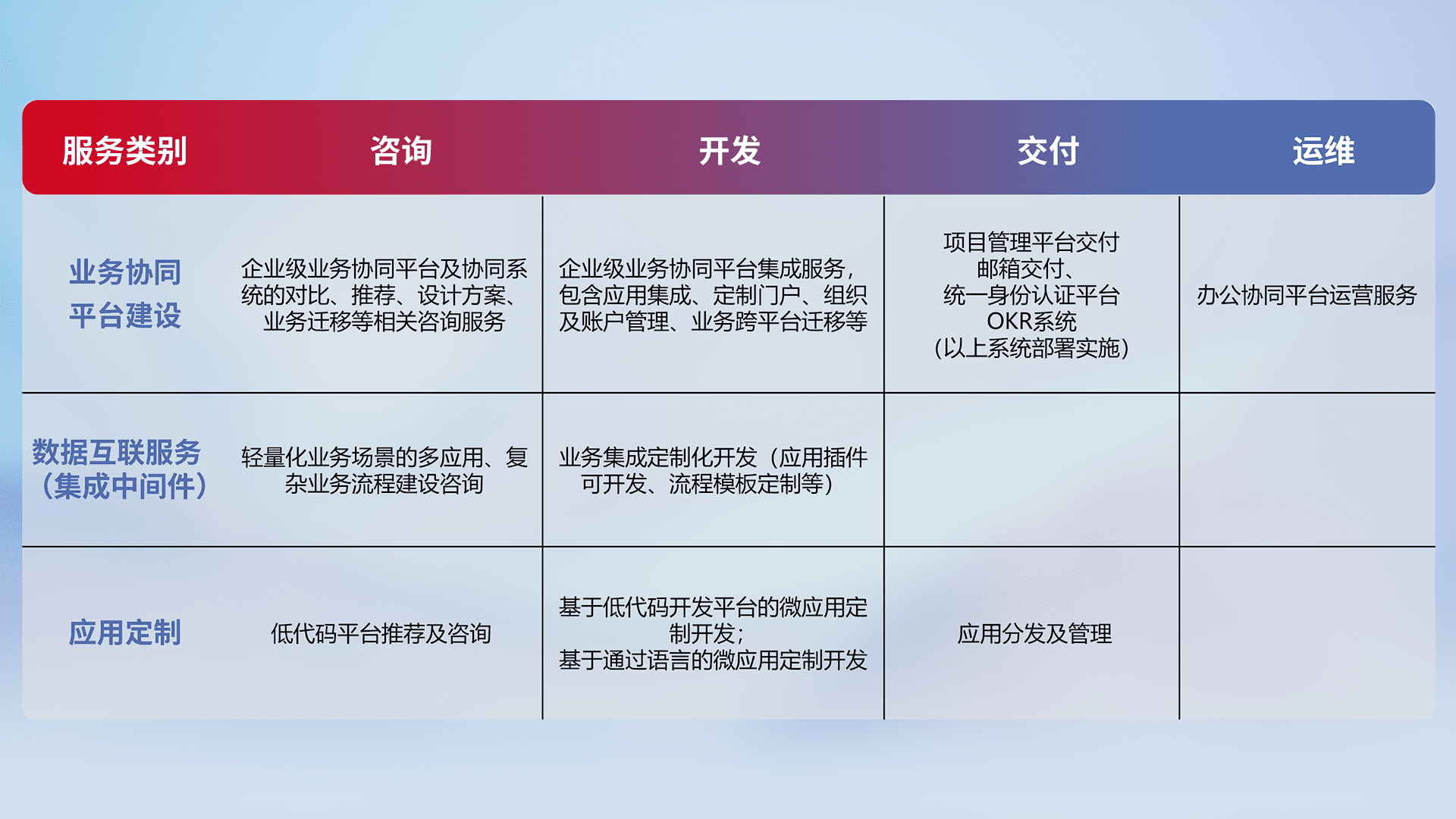 针对钉钉、、企微、、、IDaas等平台级产品提供产品的规划、、、方案、、交付、、定制化开发等服务,,,实现如统一协同办公、、智能客户服务、、、、混合会议管理、、、、智能数据查询、、、等业务场景,,,,实现数字化转型。。