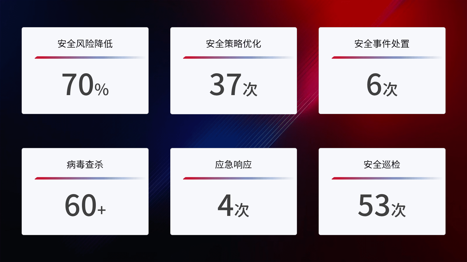 提供全面的安全事件报告体系,,,包括处置报告、、、、周报、、、季度和年度总结,,结合持续监控,,,帮助客户深入了解网络安全状况。。