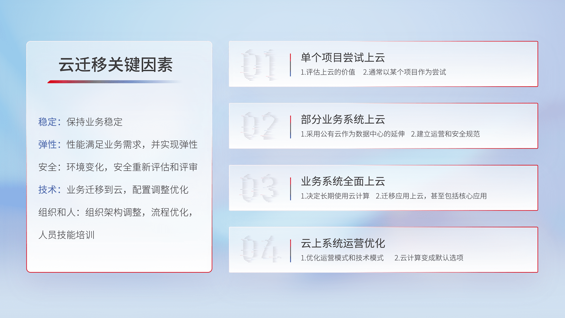 结合实际业务,,从规划设计、、、、云平台选型、、、、云原生改造、、、数据迁移、、、、集成交付,,,迁移全过程为客户识别最佳上云路径,,,,做好风险识别管理,,设计网络架构、、身份权限、、安全审计合规、、、操作审计、、日志审计、、、、监控告警策略、、多站点容灾设计等,,,,对云上基础设施进行整体规划,,提升IT治理水平,,,,以满足弹性、、高可用、、、高性能的需求。。。