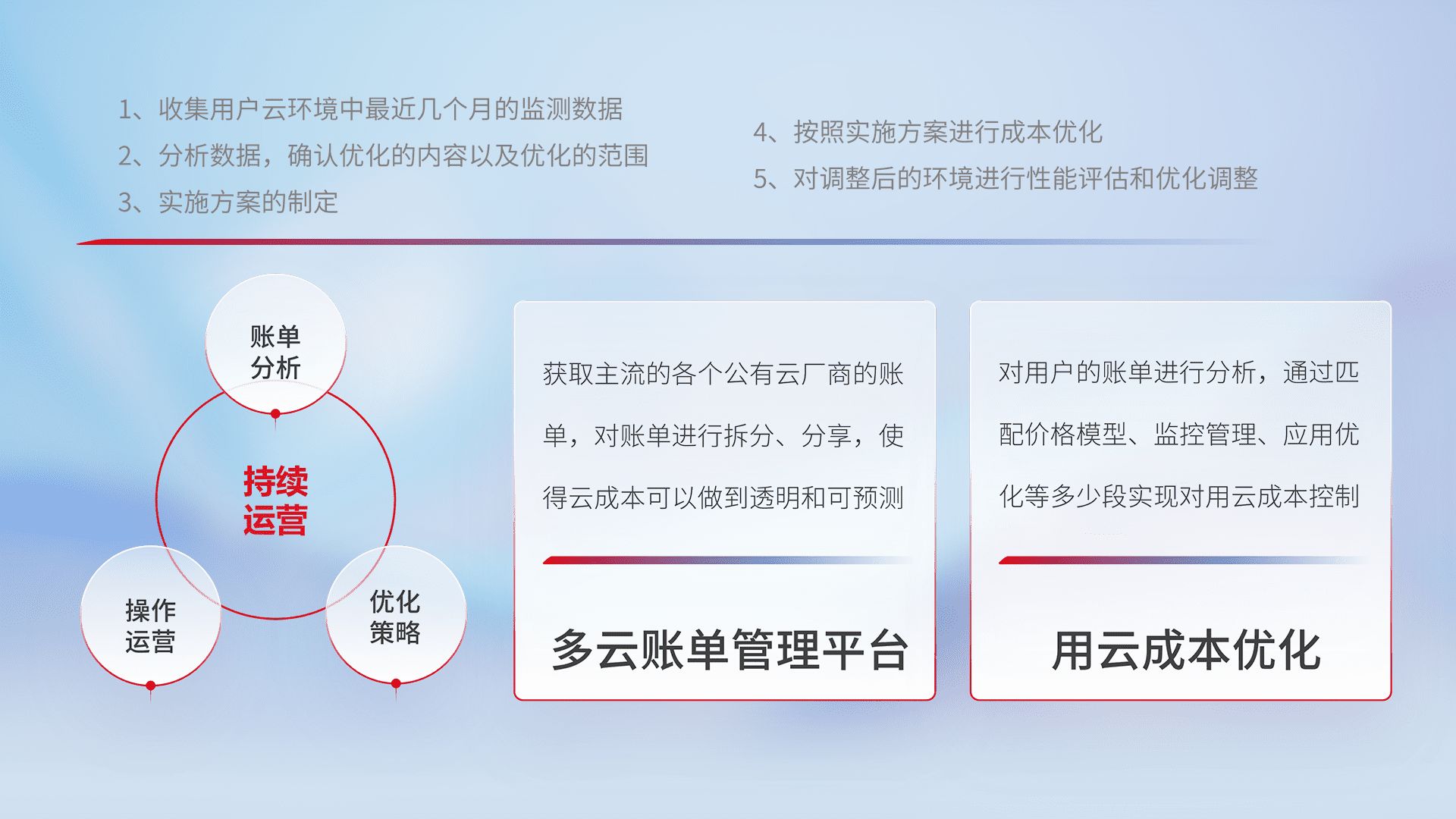 通过多云纳管,,以统一的资源数据模型把客户的云资源进行抽象和封装,,,,进而实现对多云资源的统一操作,,保障云资源管理的可靠性、、稳定性与可用性。。量身定制化运维内容,,配置、、、、开发运维、、补丁管理、、、备份、、监控、、、认证和访问管理、、审计和日常巡检等,,,,保障在用云过程中的可靠度,,,稳定度以及高可用率。。
