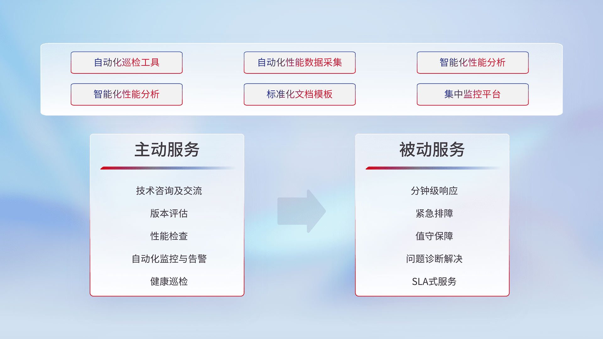 智能化工具和标准化文档,,,保障服务质量,,,,提供主动服务(包含技术咨询、、、版本评估、、、性能检查、、自动化监控与告警、、、、健康巡检)和被动服务包含(分钟级响应、、、紧急排障、、值守保障、、、问题诊断解决、、、、SLA服务)。。